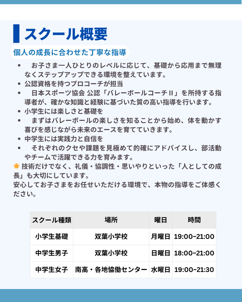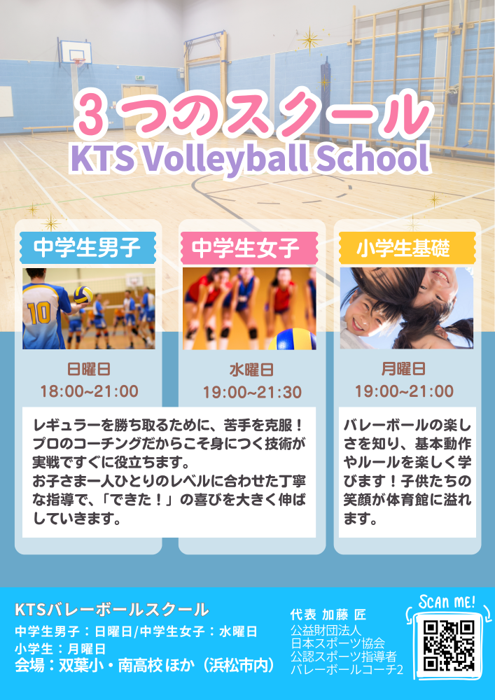 静岡県浜松市を拠点とする KTSバレーボールクラブ&スクールは、バレーボールを 本気で頑張りたい人を応援します! 子どもの頑張りたい気持ちを後押し出来るような環境づくりや指導を徹底します。  さらにバレーボールを通して人としての成長も出来るよう努めていきます。 自主性を大切に自ら考えてプレー(行動)出来る人間の育成 目配り気配り心配りが出来るプレーヤー(人間)を是非目指してもらいたいと思います。  基礎基本から応用実践や部活動だけでは教えてもらえないような内容を是非経験してください。